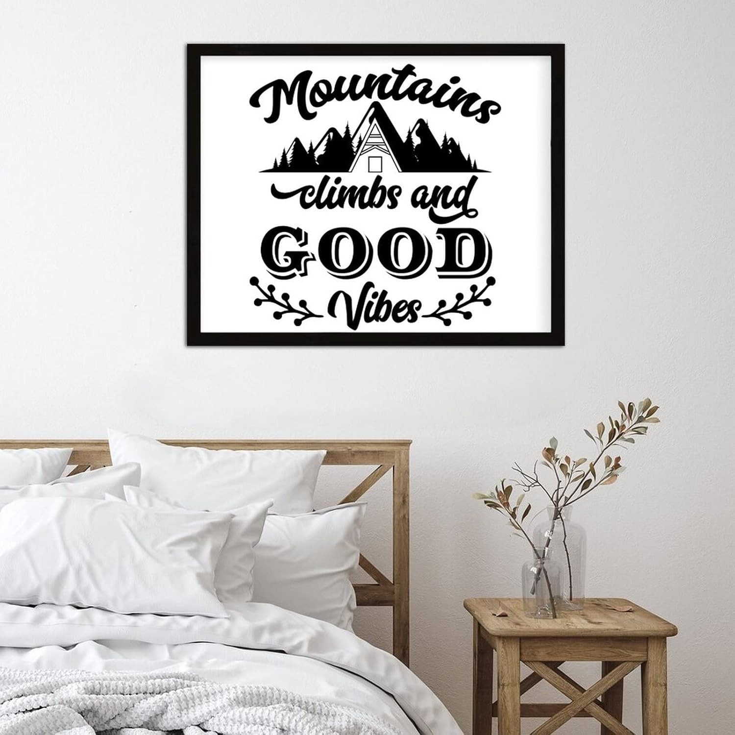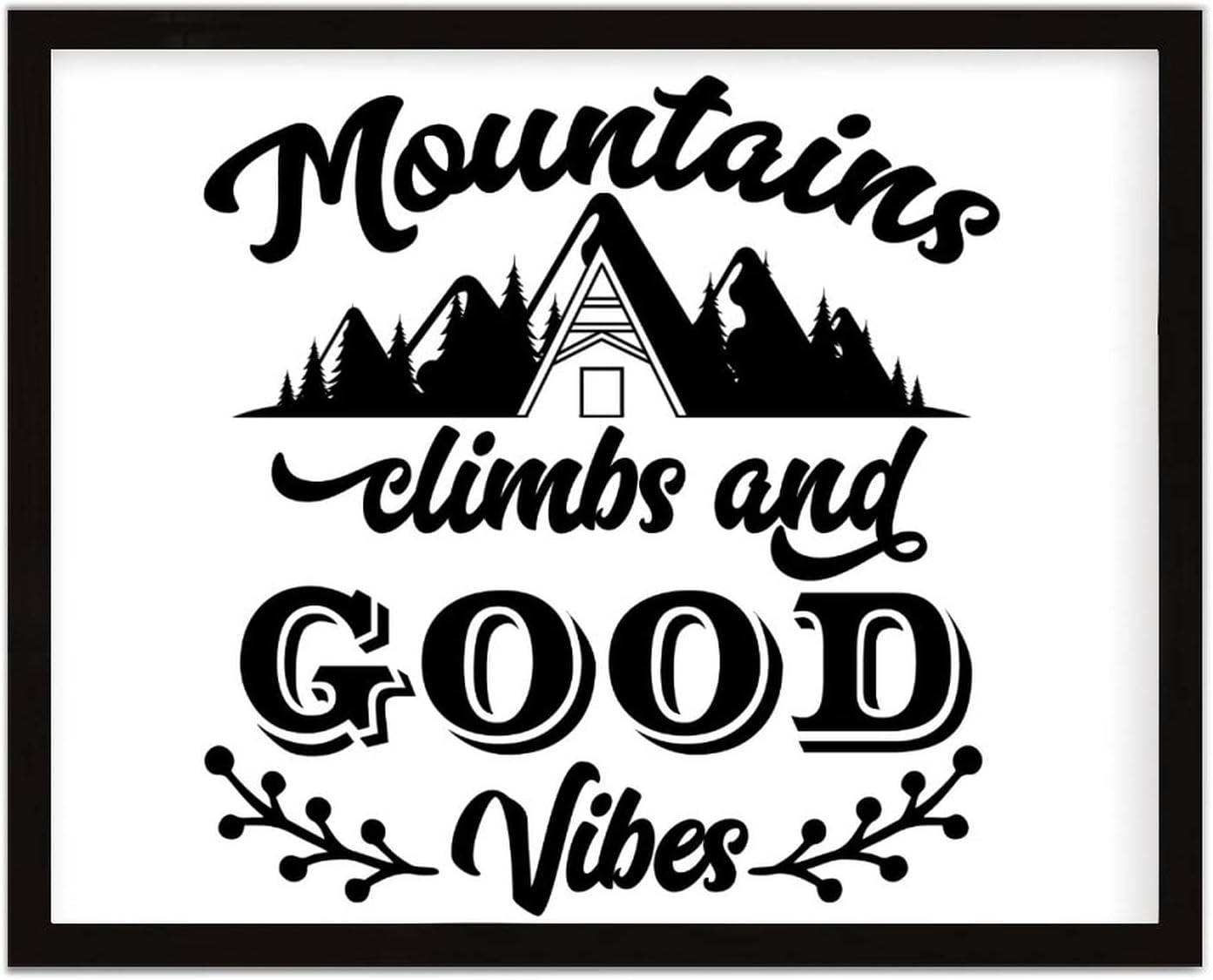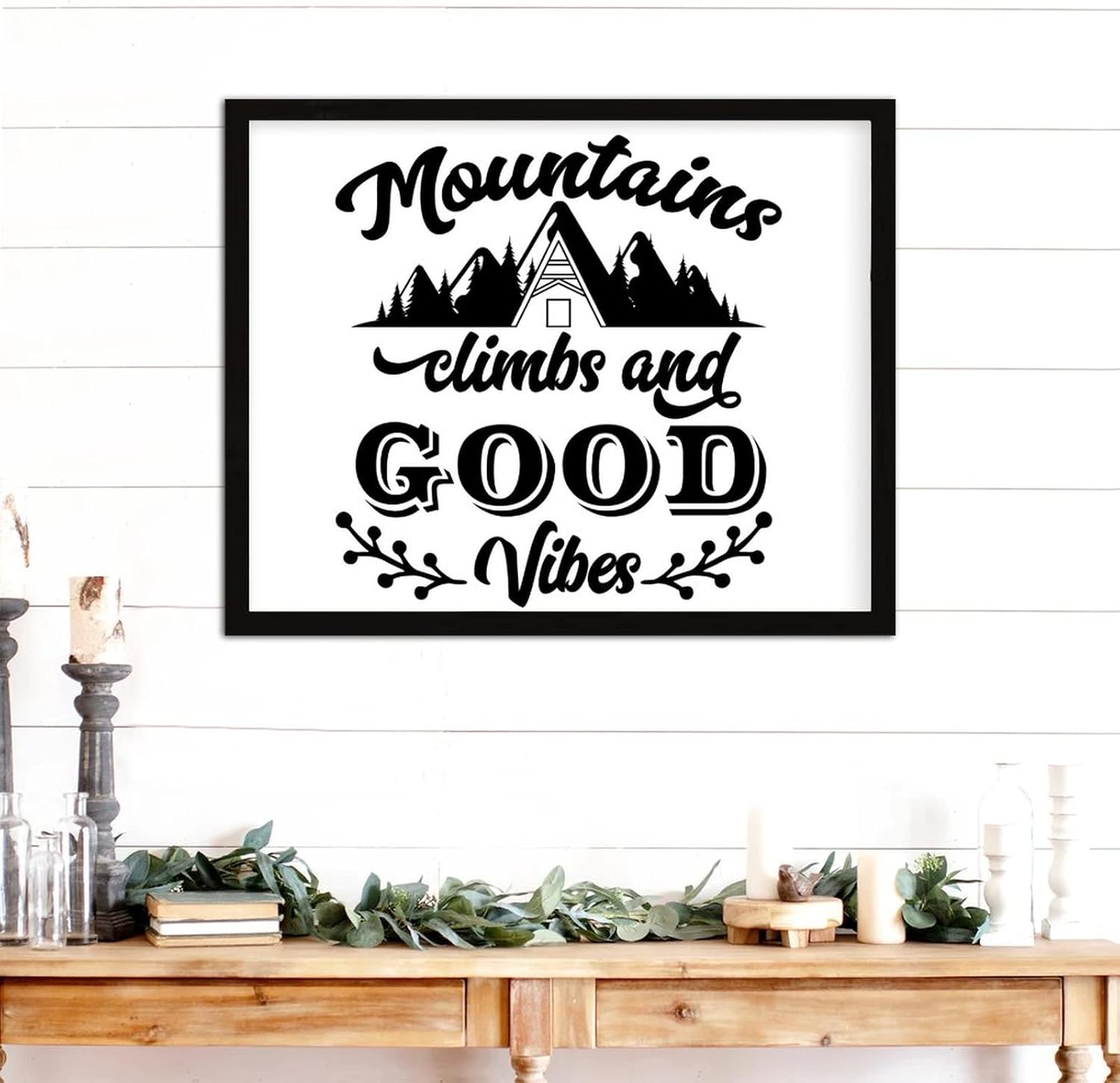 Mountains Climbs And Good Vibes Framed Wood Sign Inspirational Quotes Wood Sign 16″ x 20″ Funny Quote Wall Art Adventure Theme Motto Wooden Sign With Frame Decor For Home Living Room Bedroom