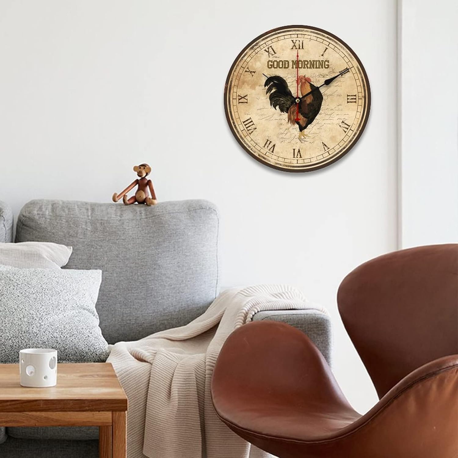 WengBeauty Good Morning Rooster Clock Cockerel Wooden Round Clock Farmhouse Pet Lover Housewarming Gift Quartz Battery Operated Decorative for Home Bathroom Bedroom 15″x15″